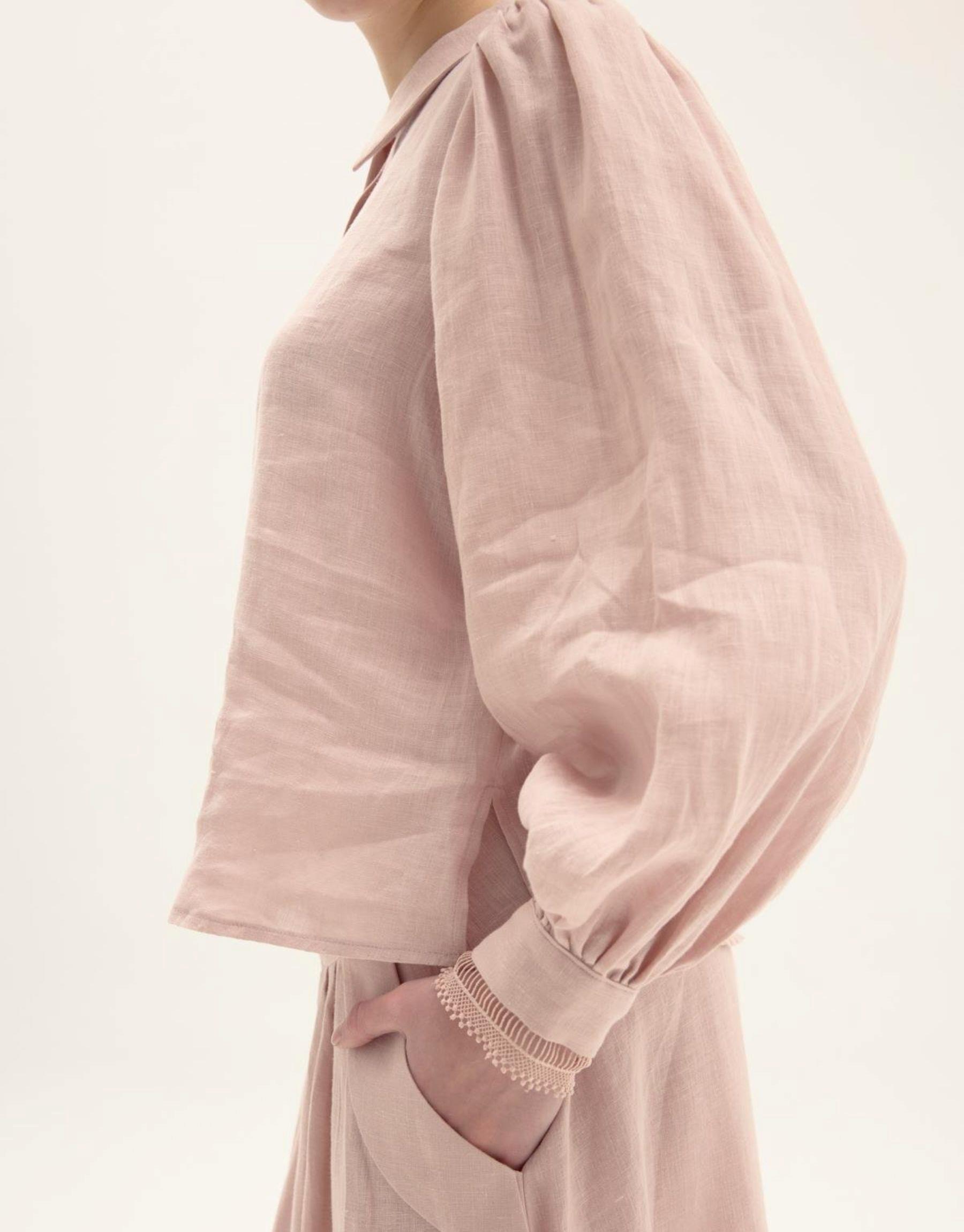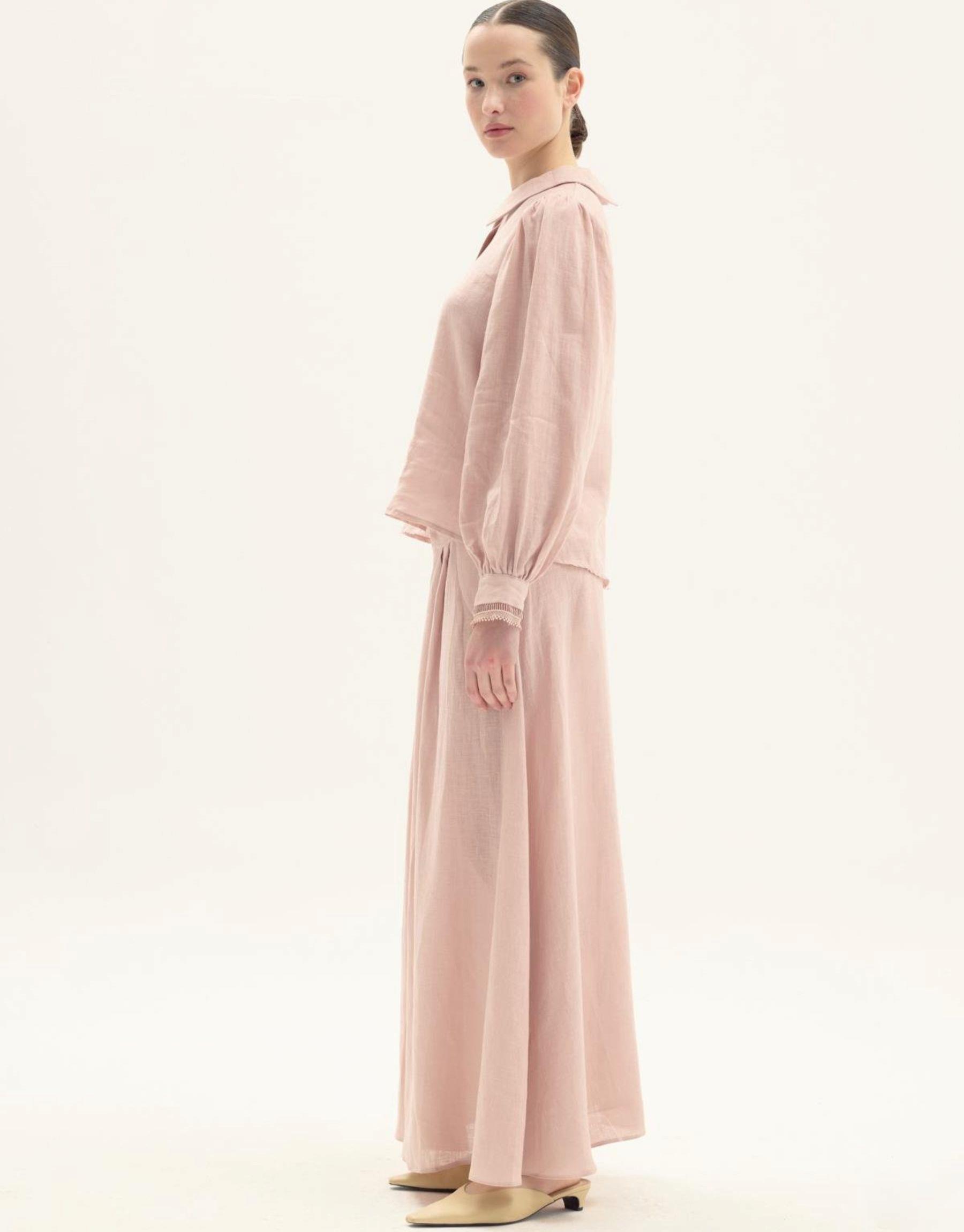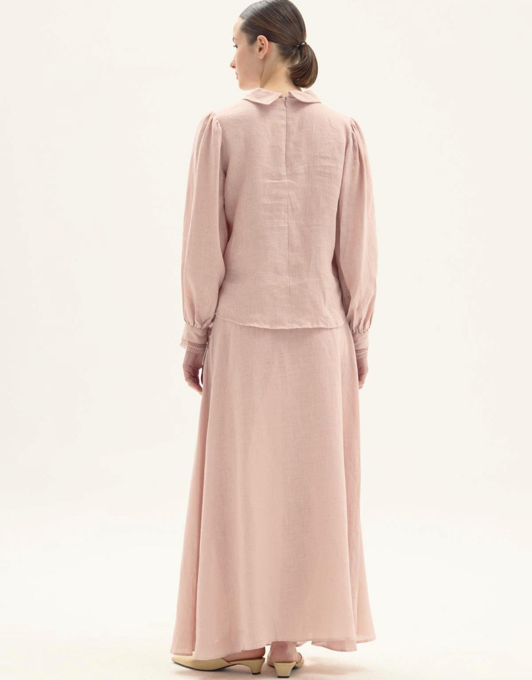 Pastel Desenli Viskon Rayon Pile Detaylı Pantolon Takım Pudra